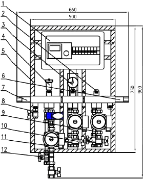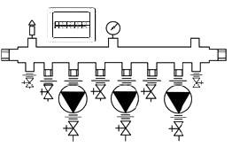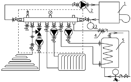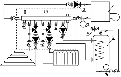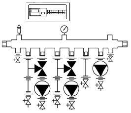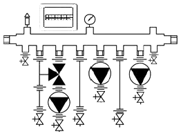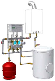 Модуль оснащен двумя (или одной) насосно-смесительными группами, одним (или двумя) прямым насосным контуром и встроенной автоматикой погодозависимого управления. Сервоприводы и датчики подключены к контроллеру. Температурные графики, временные программы и параметры контуров 1 и 2 индивидуальны. К модулю следует присоединить котел со своим насосом, бойлер-водонагреватель косвенного нагрева системы горячего водоснабжения (ГВС), с сопутствующей арматурой, контур радиаторного отопления (СО), контур напольного отопления (ТП), расширительный бак системы отопления. Принцип работыТеплоноситель циркулирует в первичном кольце, образованном коллектором и котлом под действием насоса котла. Отбор теплоносителя каждым потребителем происходит по ходу циркуляции теплоносителя: сначала высокотемпературными контурами (ГВС и СО), потом – низкотемпературными (ТП). Теплоноситель от котла может подаваться справа или слева, в зависимости от варианта исполнения модуля. Это определяет положение прямых и обратных патрубков потребителей. Отбор тепла на ГВС, СО и ТП происходит под управлением контроллера в соответствии с выбранным при настройке типом приоритета ГВС («жесткий», «мягкий», «параллельная работа» и т.д.) и значениями настроек для отопительных контуров (желаемое значение комнатной температуры, зависимость температуры теплоносителя от температуры на улице).